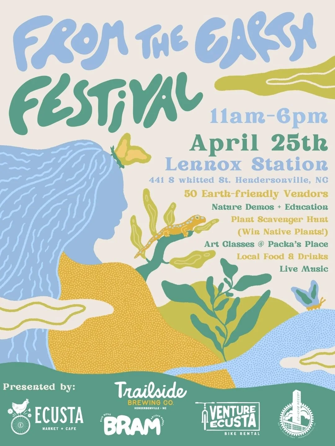 Hosted by Blue Ridge Artisan Market, the festival invites you to slow down and savor a day built around sustainable living—chat with environmental organizations about practical ways to reduce your footprint, discover eco-conscious businesses offering everything from solar solutions to refillable home goods, and fill your hands with food from local trucks serving seasonal, earth-friendly fare. With support from partners at Ecusta Trail, Ecusta Market, Trailside Brewing, and Lennox Station, this limited-waste event encourages every guest to bring their own bags, bottles, and best ideas for caring for the planet we share. Whether you come for the music, the makers, or the mission, From the Earth Festival is your invitation to celebrate what our region can create when a community comes together in honor of the Earth.